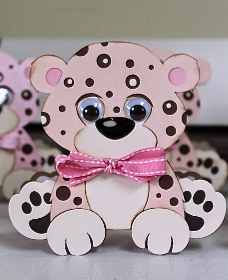 The Silhouette Cameo worked overtime on these. The image is from the Silhouette Store and there are several layers. We used several different types of card stock in order to give added texture and dimension. The pink Bazzill card stock has a slight shimmer to it. They are quite pretty in real life. The nose is coated with Stampin' Up! Crystal Effects and rather than use the eyes that were part of the original cut design, we just had to use wiggly eyes. All of the pertinent shower information is on the inside. It was a piece of cake to add the text to the shape of the leopard in Silhouette Studio. Then it was just a matter of printing and then back in the Silhouette to cut it out.