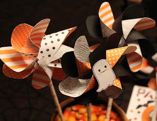 The pinwheels were easily cut, punched and assembled using the We R Memories Pinwheel Punch Board. I continued with the gauze pattern stamp and also used a polka dot stamp, which works well with the Recollections pp. I popped on a MCT ghost to the centers. I had to "borrow" two of them for another project photo shoot, but they are back where they belong, spinning away on the pinwheels.